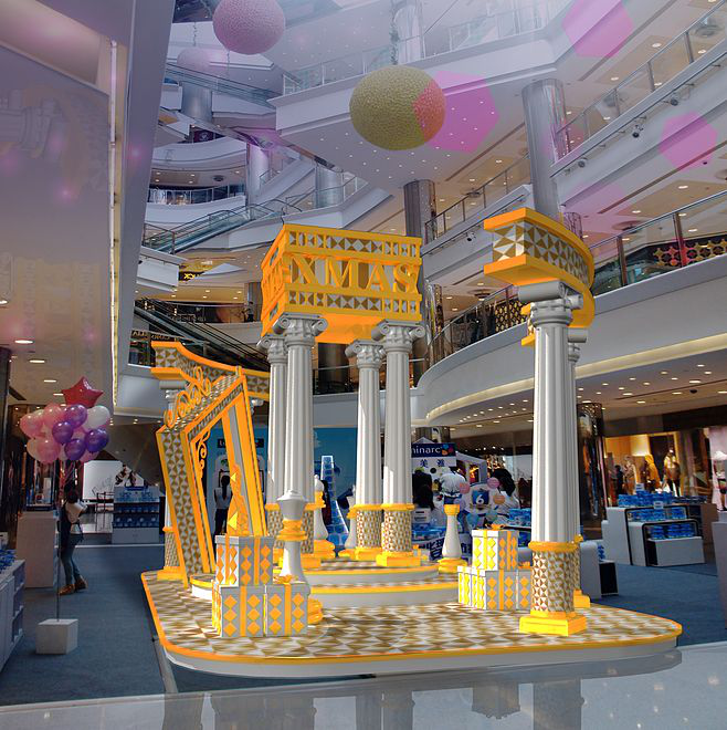 以商場為例,按區(qū)域功能由外至內(nèi)分為:戶外街道燈裝飾、大型主題場景、戶外幕墻亮化、大門裝飾、通道走廊裝飾、中空裝飾、DP點造型、櫥窗裝飾。商業(yè)美陳的布置是在指定的區(qū)域,根據(jù)季節(jié)及節(jié)慶日相應(yīng)的環(huán)境打造相應(yīng)的效果。除了節(jié)慶日相關(guān)因素,商家的宣傳主題及周邊環(huán)境也是美陳場景布置主題不可忽略的部分。